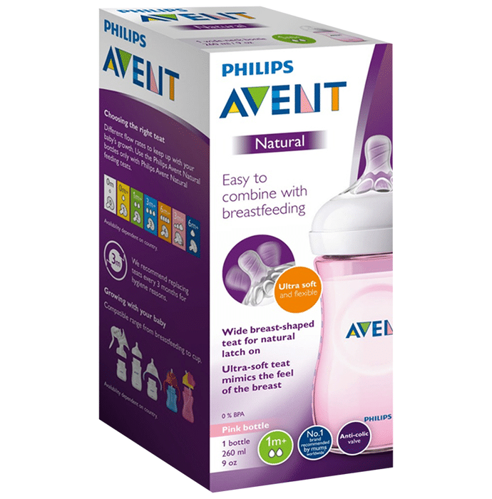 Philips Avent Natural Feeding Bottle Philips Avent Natural Baby Bottle is the healthiest approach to bottle feed. The large breast-shaped nipple encourages a natural latch-on, allowing you to breastfeed and bottle feed at the same time. The comfort petals and our flexible spiral design allow for natural movement while the infant feeds. The Airflex vent technology in the nipples is designed to relieve colic and discomfort by venting air away from the baby's stomach. | Uses: It is ideal for newborns and is used to help babies combine breast and bottle feeding. | Product Specifications and Features: Natural nipple shape and feel makes it easy for baby to combine with breastfeeding Wide breast-shaped silicone nipple promotes natural latch on making it easy to combine with breastfeeding Ultra soft nipple mimics the feel of the breast Unique Airflex valve technology integrated into the nipple is designed to reduce feeding issues by venting air away from your baby's tummy | Directions For Use: Use as directed on the label or as advised by your healthcare provider/ physician/nutritionist. | Safety Information: Read the label carefully before use Store in a cool and dry place away from direct sunlight Keep out of reach of children