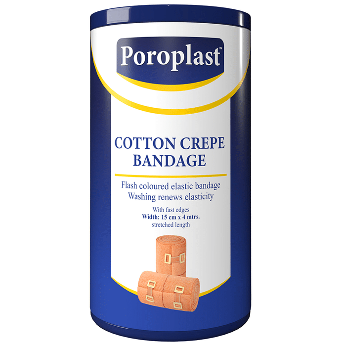 Poroplast Cotton Crepe Bandage 15cm x 4m Poroplast Cotton Crepe Bandage 15cm x 4m is a cotton bandage suitable for sprains and strains in joints and muscles. It is made of thick skin-friendly material that is not harsh on the skin. It works as a moderate compression bandage that provides warmth for knee swelling, ankle swelling and other related injuries.