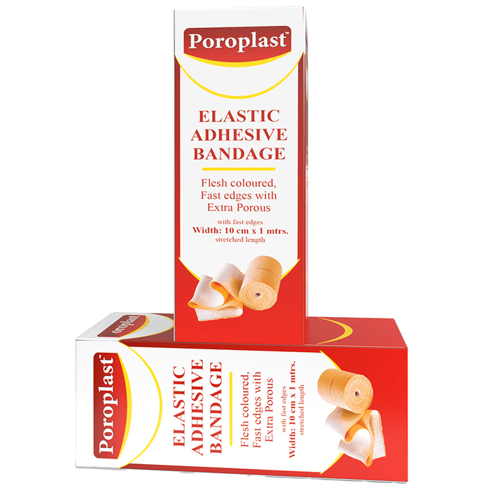 Poroplast Elastic Adhesive Bandage 10cm x 1m Poroplast Elastic Adhesive Bandage 10cm x 1m is an adhesive bandage for muscle support and joint sprains and strains. It functions as a bandage with mild compression that offers warmth for swelling in the knee, ankle and other related injuries. It has a thick but gentle fabric that is not harsh on the skin.