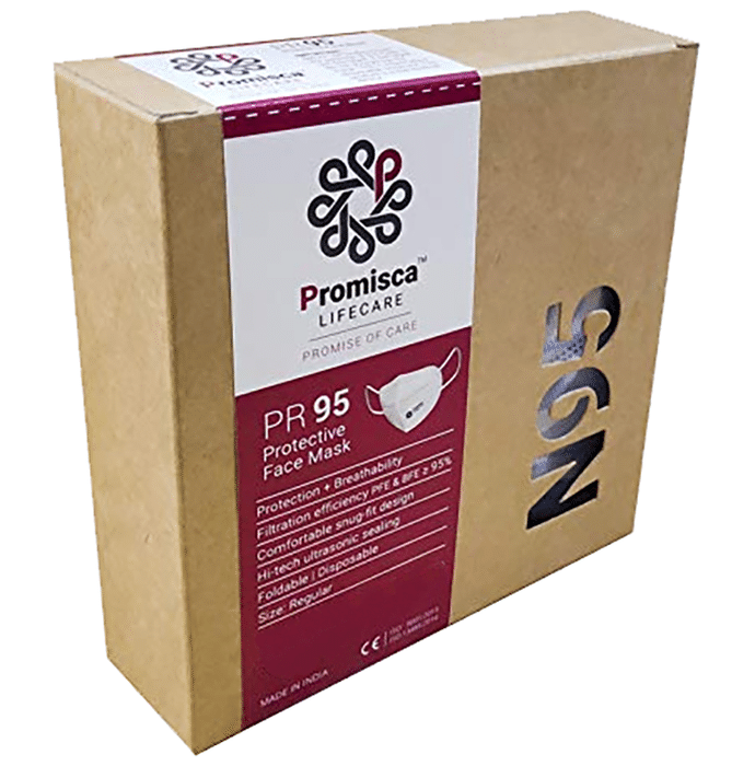 Promisca PR 95 N95 Protective Face Mask Regular is a 5-ply face mask in a non-woven fabric that is skin-friendly for maximum comfort. It protects against viruses, bacteria, allergens and pollutants. The outermost layer comprises virgin quality hydrophobic coated nonwoven fabric, and the inner layers are composed of a natural melt-blown material that provides 95%+ filtration. | Uses Filters odour and provides better breathability Protects against dust, suspended particulates, and other environmental hazards Ensures reliable protection against germs and infections | Product Specifications and Features Light weight, comfortable, durable and stretchable straps with dual point attachments High-quality elastic ear bands that are comfortable to attach and wear Ultrasonic sealing of straps and in-built nose pin, which enables snug fit Composed of advanced, skin-friendly and non-woven cotton and melt-blown fabric | Directions For Use: Wash hands with soap Place the mask on your face Pull ear-loops to wear mask Press nose clip, ensure proper fit | Safety Information: Read the label carefully before use Store in a cool and dry place, away from sunlight For external use only