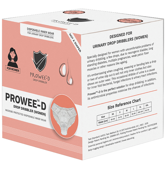 Prowee-D Drop Dribbler (Women) Microbe Protected Disposable Inner Wear Prowee disposable women’s Incontinence panty for drop dribble is a specially designed solution for ladies who are facing minor UI; It is more common in women than men. It is a condition induced due to stress, overactive bladder, pregnancy or menopause. Urine leak may happen with cough, sneezing, laughing or under pressure, It becomes embarrassing and restrains activity; Prowee Drop Dribbler disposable panty which is fitted with anion chip liner helps to manage this with ease, boosting the confidence and relieving the individual from wetness and unpleasant odour. It does not let the leak spoil or stain outerwear. After urinating seeping of an extra drop to outerwear is also prevented. | | Uses: It can be worn as a normal panty and is a handy essential for travelling, vacations, trekking, camping, overseas trips, and hospital stays Panty is made out of hydrophilic material for good absorption of sweat or extra wetness This disposable Panty is a body-hugging “feather fit”, lightweight, treated with antimicrobial agents (certified by an accredited lab), it does not allow mould or fungi to survive in skin folds around intimate parts and keeps the area dry | | Product Specification: The Uniqueness of ladies' panty design is registered under registration No 336966 issued by the controller general of patent designs and trademarks Anion chip pad used for absorbance releases negative Ions that boost energy, strengthen immunity, increase metabolism, improve blood circulation, it acts as an antidepressant Panty is made with soft, lightweight and body-hugging partially biodegradable viscose blend material Antimicrobial to provide additional support for recovery from infection Compact pack for the ease of carrying | | Directions For Use: Unpack and it is ready for use Wear a normal Panty For disposal refer to the directions on the box | | Safety Information: Replace once soiled or loaded Do not wash or reuse In the highly unlikely state of irritation or rash, discontinue the usage Do not flush Dispose of in the dry waste bin Not suitable for Unusual stretch