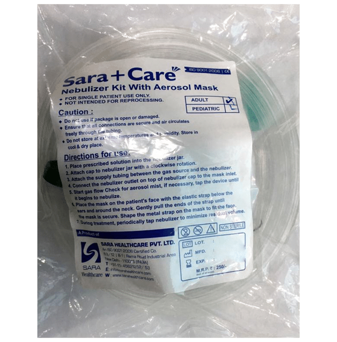 Sara+Care Nebulizer Kit with Aerosol Mask Pediatric It is flexible and easy to clean and fits with almost all nebulizer machines. It is a drug-device used to handle medication in the form of a mist inhaled into the lungs. It is mainly used to treat cystic fibrosis, asthma and other respiratory diseases or conditions. | Uses: It helps to remove the excess mucus from the respiratory tracts. | Product Specification and Features: It has high efficiency and gives the full advantage of medicine and steady mist spraying It is portable and lightweight It is simple and easy to use It is commonly used in every household | Directions For Use: Read the manual or as directed by the doctor. Safety Information: Read the label carefully before use Store in a cool and dry place away from direct sunlight Keep out of reach of children