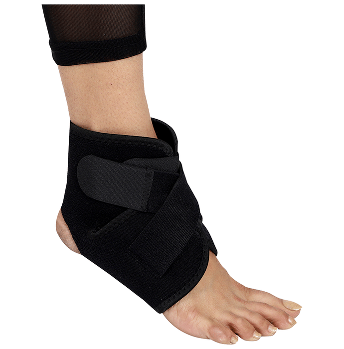 Skudgear Advanced Breathable Neoprene Ankle Support Compression Brace Free Size is strong and reliable support for stabilising weak ankle joints after acute injuries such as muscle strains, sprains or surgery. It is specifically designed to reduce the risk of injury during laborious activities and also helps to relieve symptoms and oedema associated with acute injuries, which are associated with sprains, tendonitis, and arthritis is ideal for. | Uses: It reduces the risk of injury during laborious activities and also helps to relieve symptoms and oedema associated with acute injuries. | Product Specifications and Features: It is made from high-quality elastic and moisture-wicking ingredients The open heel design allows for a wide range of motion during activity but still provides support for the ligaments and joints of the ankle The holes ensure air passage and can be worn comfortably throughout the day It is fitted with crisscross reinforcement straps to provide strong support and stabilisation for the ligaments and joints of the ankle | Directions For Use: Use as directed on the label or as advised by a health care professional | Safety Information: Read the label carefully before use Store in a cool, dry place away from direct sunlight Keep out of reach of the children