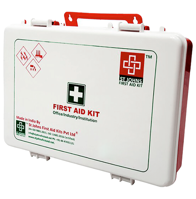 St Johns SJF-P1 Workplace First Aid Kit A first aid kit is a collection of supplies and equipment that is used to give medical treatment. There is a wide variation in the contents of first aid kits based on the knowledge and experience of those putting it together, the differing first aid requirements of the area where it may be used and variations in legislation or regulation in a given area. Uses: Many medical items are included in the box, which may be utilised to treat an injury straight away. | Contents: 1 pc Tourniquets 1 pc Kidney tray 1 pc Blood lancet 1 pc Potassium permanganate 1 pc Eye/Ear drops 5ml 1 pc Normal saline 100ml 1 pc Tincture iodine 20ml 2 pcs Examination gloves 2 pcs Triangbrar bandage 2 pcs Wooden splint 5 pcs Electrolyte powder 4.2gms 10 pcs Safety pin 10 pcs Adhesive plaster 19x72mm 14 pcs Aspirin 75mg Tablet | Product Specification and Features: It contains 75 components and is suitable for 10 persons It is used to provide critical aid before medical assistance arrives It helps to avoid infections It keeps a serious injury from becoming a persistent problem It also stops excessive bleeding Directions For Use: Read the label carefully | Safety Information: Keep out of the reach and sight of children Read the label carefully before use Store in a cool dry place and away from direct sunlight