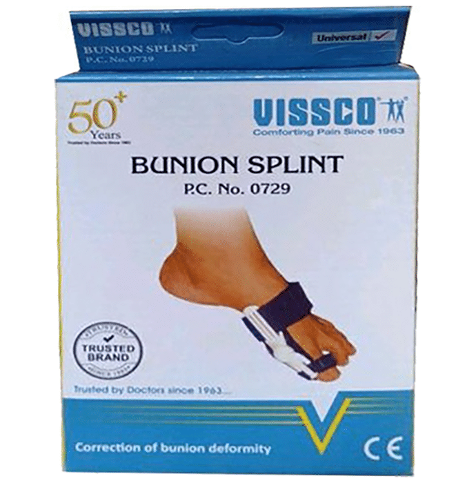 Vissco Bunion Splint 0729 helps to prevent the deformity of the bunion region. It helps align its position and reduces pain and discomfort. Moreover, it facilitates rigid support which makes recovery faster. | Uses: It is useful in the condition of Halux Valgus (bunion) and deformity of big toe. | Product Specifications and Features: It helps to support and hold the metatarsal and arch area of the foot with a tight fitting band and can be used in the day or night Made from neoprene rubber which provides softness as well as retains body heat which aids further recovery Contains moving hinge which provides rigidity and ease of movement The fabric is tested for its anti fungal and anti bacterial properties | Note: | Warranty: 6 Months | Customer Care Id: [email protected] | Customer Care Number: 022-43330376 (Monday to Saturday (10 am to 6 pm)) | Directions For Use: Use as per requirement or as directed by the physician. | Safety Information: Read the label carefully before use Store in a cool dry place away from direct sunlight Keep out of reach of the children Avoid physical damage