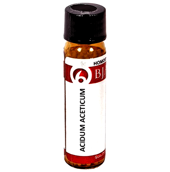 Bjain Acidum Aceticum Globules 6 CH Bjain Acidum Aceticum Globules is a homoeopathic medicine with a wide range of uses. It can be used to manage anaemia, dropsical conditions, debility, frequent fainting, haemorrhages, weak heart rate, nausea, vomiting, profuse urination and sweat. It can also be used in treating albuminous and fibrinous deposits, malignant growths, nodules in the joints for painless ulcers on genitalia.