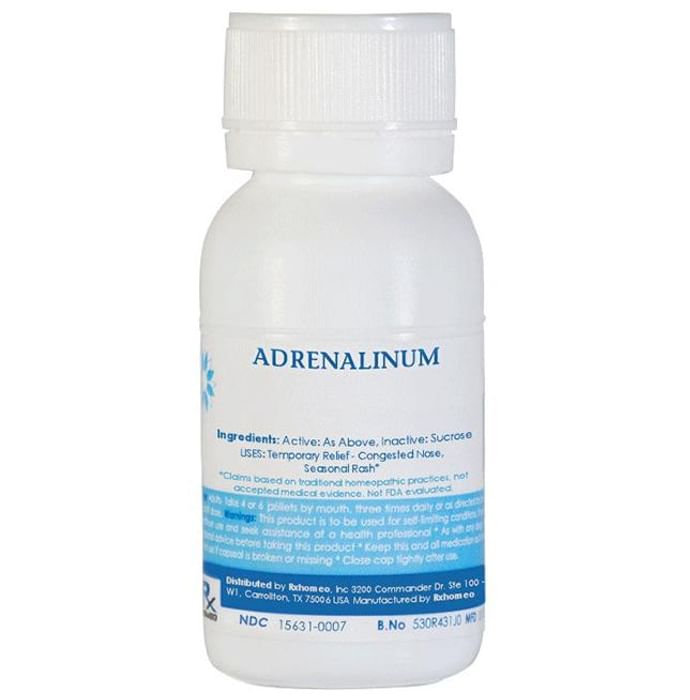 Bjain Adrenalinum Globules is a homeopathic remedy used in cases of chest congestion, abdomin nal pain, respiratory and skin problems. | Key Ingredients: Adrenalinum | Key Benefits: Helps to improves lost strength and prevents sudden weight loss Helps decrease hemorrhages from orifices Helpful as an astringent and treats various pains in the body Reduces very rapid pulse and pain in chest with anxiety Decreases contraction of muscles and sensation of constriction with great anguish Reduces thickening of the vessels Helps to treat seasonal allergies, difficulty in breathing and congestion of the sinuses Reduces acute rashes, darkening and bronzing of skin Decreases abdominal pain with vertigo, nausea and vomiting | Directions For Use: Bjain Adrenalinum Globules should be taken 3-5 drops in half cup of water three times a day or as directed by the physician. | Safety Information: Do not exceed the recommended dose Keep out of the reach of children Store in cool and dry place Should be protected from direct light