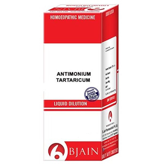 Bjain Antimonium Tartaricum Dilution is a homeopathic medicine obtained from Antimonium Tartaricum herb. | Key Ingredients: Antimonium Tartaricum | Key Benefits: It is used for treatment of asthma, lung failure, cough, vomiting and alcoholic liver problems It helps to ease out mucus and cough It relieves problem of shortness of breath during cough and congestion It aids in treatment of pneumonia and helps to expectorate mucus out of lungs It relieves backache and heaviness in limbs | Direction for Use: As directed by the physician. | Safety Information: Read the label carefully before use Avoid any strong smell in the mouth such as coffee, hing, onion, mint, camphor, garlic etc while taking the medicine Keep at least half an hour gap between food/drink/ any other medicines and allopathic medicines Keep out of the reach of children Store in a cool and dry place, away from sunlight Do not exceed the recommended dosage If pregnant or breastfeeding, ask a homeopathic practitioner before use
