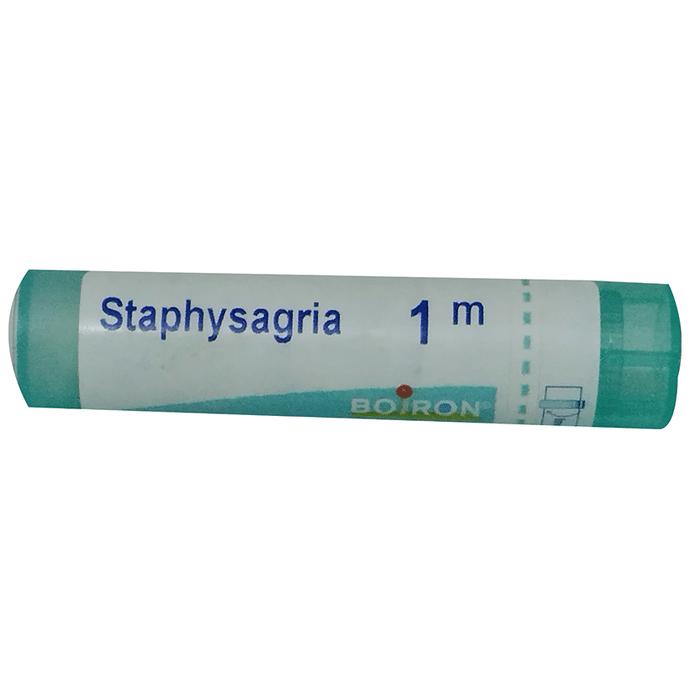 Boiron Staphysagria Pellets 1M Boiron Staphysagria Multi Dose Approx 80 Pellets is effective against irritability and exhaustion. It suppresses anger and helps in sea sickness. It is helpful in children's teeth problems and colicky pain. It is an effective solution for headache and many types of scalp problems including hair fall, dandruff and eczema. Many other types of skin, ear, mouth, stomach and urinary complaints are resolved by using it.