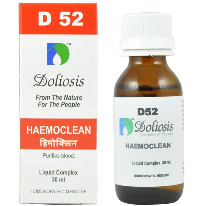 Doliosis D52 Haemoclean Drop helps to eliminate the toxicity of the circulatory system and may assist in the recovery of the condition related to impure blood. It may enhance the immunity system to fight against various virus attacks. | Key Ingredients: Echinacea rudbeckia Anthracinum Crotalus horidus Pyrogenium Ferrum metallicum Extra neutral alcohol | Key Benefits: It may help in purifying the blood It may remove toxins from the circulatory system It may enhance your general health by enhancing your immunity power | Directions For Use: As mentioned on the label Or as advised by your healthcare practitioner | Safety Information: Read the label carefully before use Store in a cool and dry place, away from sunlight Keep out of reach of children