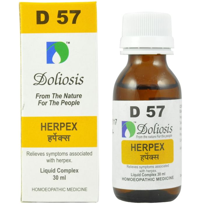 Doliosis D57 Herpex Drops is a homeopathic medication that helps to manage the symptoms associated with herpes. It helps relieve the pain caused by the sores or blisters. | Key Ingredients: Rhus tox Tellurium Cantharis mezereum | Key Benefits: It helps to manage symptoms related to herpes It provides relief from inflammation, itching and pain around the mouth or the genitals It helps to manage the sores and the blisters caused by herpes | Directions For Use: Use as directed on the label or by the physician Read the label before use | Safety Information: Keep out of reach of children Store in a cool and dry place Do not exceed the recommended dosage Self-medication is not advisable