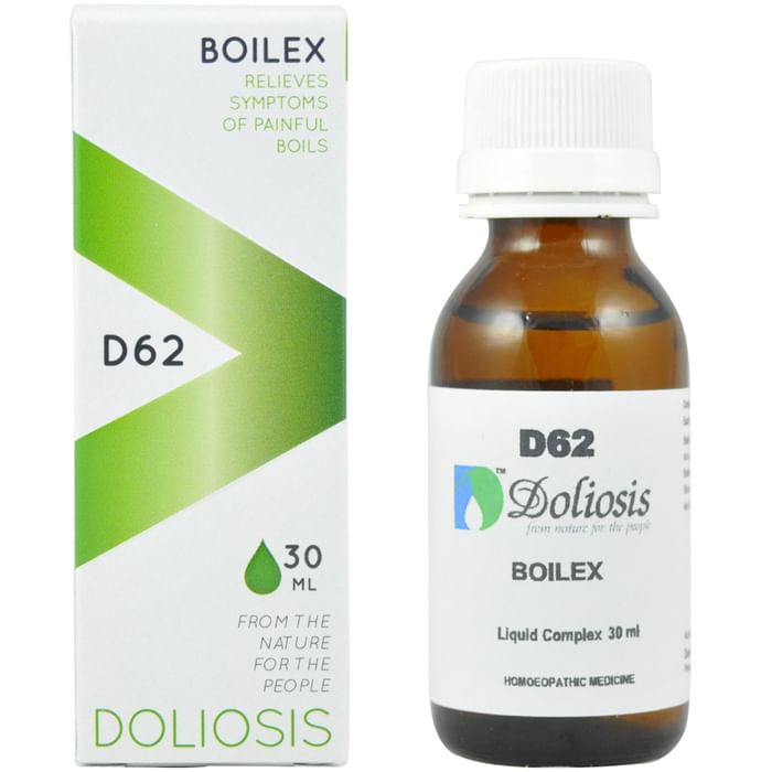 Doliosis D62 Boilex Drop relieves the symptoms of painful boils, such as redness and pus development, wherever they appear on the body. It contains Arnica montana, which promotes faster wound healing and also aids in the reduction of dandruff and irritation. | Key Ingredients: Apis mellifica Arnica montana Belladonna bellis Perennis silicea | Key Benefits: Doliosis D62 Boilex Drop is beneficial for providing relief from skin issues such as boils and rashes It contains Arnica montana which aids in faster wound healing and provides relief from bug bites It also aids in reducing dandruff and irritation and helps in addressing local skin infections | Directions For Use: Use as directed on the label or as advised by your physician. | Safety Information: Read the label carefully before use Do not exceed the recommended dosage Store in a cool and dry place away from direct sunlight Keep out of reach of children
