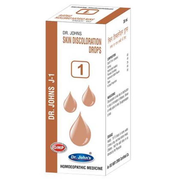 Dr. Johns J-1 Skin Discoloration Drop Indications: Discoloration of skin due to destruction or lack of formation of Melanin. Brown or milky spots on the skin. De-pigmentation of skin.