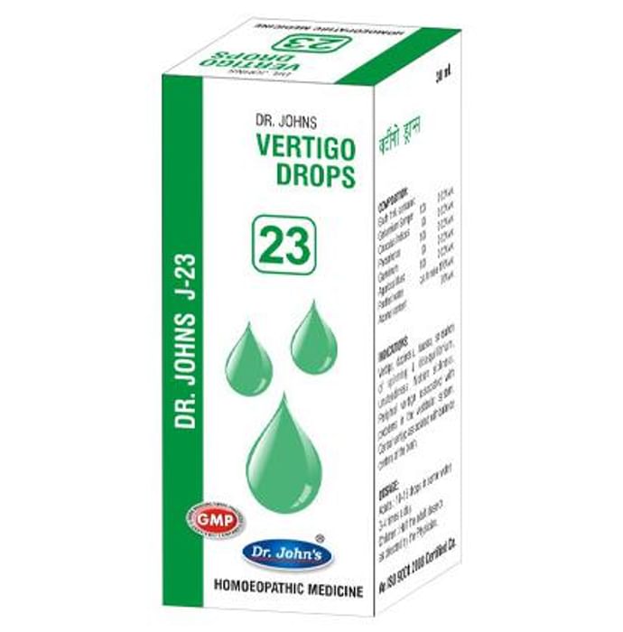 Dr. Johns J-23 Vertigo Drop Indications: Vertigo, dizziness, nausea, the sensation of spinning & disequilibrium, unsteadiness. Motion sickness.Peripheral vertigo associated with problems in the vestibular system.Central vertigo associated with balance centers of the brain.