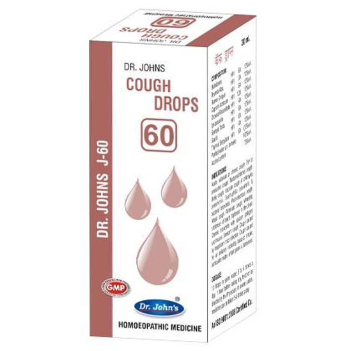 Dr. Johns J-60 Cough Drop is a homeopathic preparation indicated for the management of dry or productive cough, nocturnal or diurnal cough. It helps to treat symptoms such as shortness of breath as well. Key Ingredients: Belladonna Bryonia Alba Rumex Crispus Cuprum Aceticum Drosera Rotundifolia Ipecacuanha Spongia Tosta. Key Benefits: Used for the management of different types of cough such as acute, subacute or chronic cough and its associated symptoms It helps manage dry or productive cough, nocturnal or diurnal cough and to treat symptoms such as shortness of breath as well Useful for the treatment of symptoms such as staccato cough of chlamydia pneumonia, eosinophilic bronchitis, and bacterial bronchitis The cough drop can be beneficial for smokers cough Directions For Use: Take Dr. Johns J-60 Cough Drop as directed by the physician As directed, one can take 10 drops in some water, 3 to 4 times a day It is recommended to take these drops 1 hour before taking any food Safety Information: Read the label carefully before use Keep out of the reach of children Do not exceed the recommended dose Avoid alcohol consumption If pregnant or breastfeeding, make sure you consult your homeopathic practitioner before use
