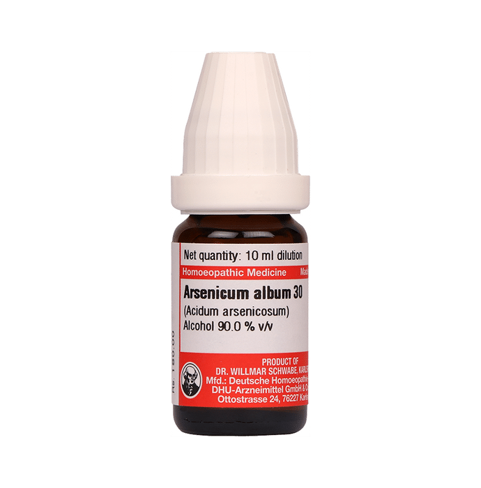 Dr Willmar Schwabe Germany Arsenicum Album Dilution 30 Arsenicum album is a homoeopathic dilution which is indicated for many conditions and complaints. It has great action on mind and used in the treatment of anxiety and fear caused by insecurity. It has its main action on the digestive system especially on the mucous membranes. it is also used in the treatment of allergies, depression, sleep problems and obsessive compulsive disorders. | Key Ingredients: Ethanolic dilution of Aresenicum Album | Key Benefits: Helpful in anxiety and fear Prescribed in a variety of conditions by homoeopathy Should be taken as per homoeopathic literature | Directions For Use: Unless otherwise prescribed by the physician 4-5 drops 2-3 times a day in ½ cup water | Safety Information: Read the label carefully before use Store in a cool and dry place away from direct sunlight Keep out of reach of children