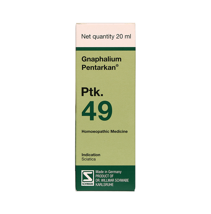 Dr Willmar Schwabe Germany Gnaphalium Pentarkan Ptk. 49 Drop is used for the management of pain conditions associated with sciatica (lumbar sciatica). Sciatica refers to pain that radiates along the path of the sciatic nerve, which branches from your lower back through your hips and buttocks and down each leg. Typically, sciatica affects only one side of your body. | Key Ingredients: Gnaphalium polycephalum 1X 10 g Phytolacca 1X 10 g Aconitum 3X 10 g Dulcamara 2X 10 g Rhus toxicodendron 3X 10 g | Key Benefits: Helps in the management of sciatic pain May help relieve several other neuron-muscular pains Can prove beneficial in strengthening nerves | Directions For Use: Unless otherwise prescribed by the physician For acute complaints, adults and adolescents from the age of 12 should take 5 drops (maximum 6 times daily) In chronic cases, adults and adolescents 12 years and older should take 5 drops (maximum 1 to 3 times daily) | Safety Information: Read the label carefully before use Store in a cool and dry place away from direct sunlight Keep out of reach of children