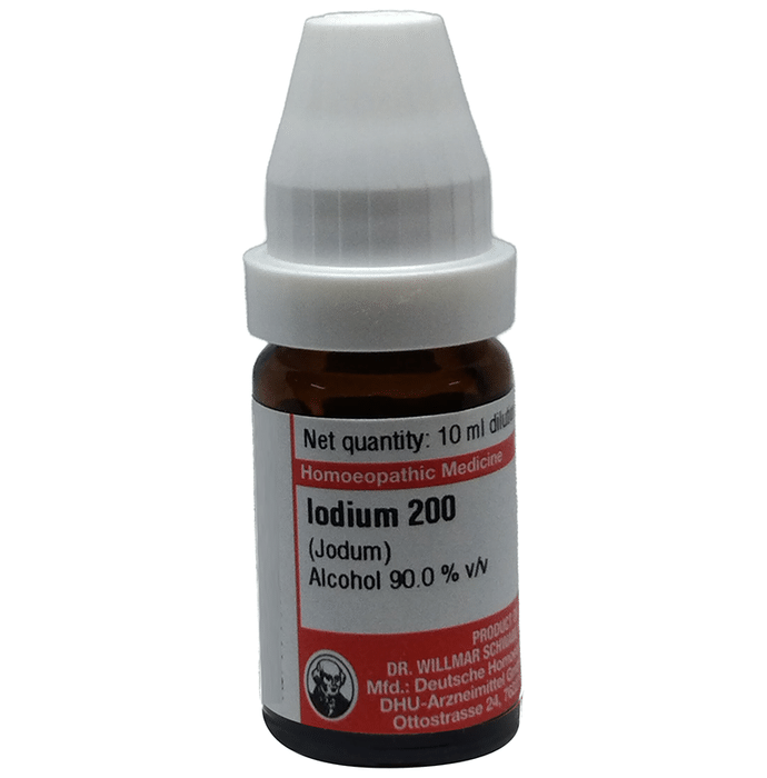 Dr Willmar Schwabe Germany Iodium Dilution It helps with conditions related to the gland. Conditions of weakness and breathlessness due to climbing are also addressed using this medicine. It also helps manage many mental, nose and head conditions. | Key Ingredients: Iodium | Key Benefits: It helps relieve congestive headache, vertigo and blood rushing to the head Improves smell and nasal blockage and reduces sneezing with hot discharge Helps in regulating menses and reduces weakness in women | Directions For Use: Use as directed on the label or as advised by your healthcare provider. | Safety Information: Read the label carefully before use Store in a cool and dry place away from direct sunlight Keep out of reach of children