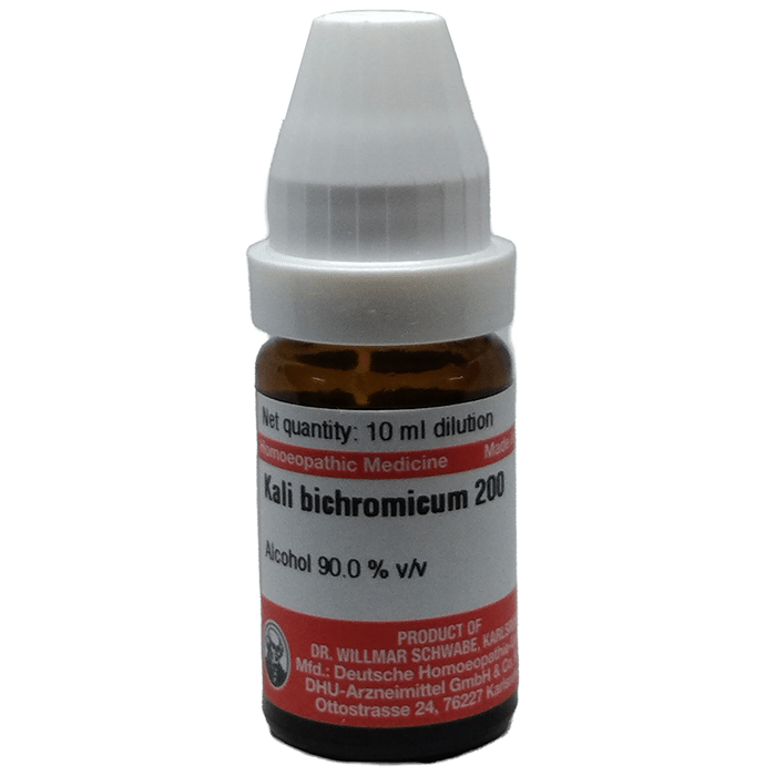 Dr Willmar Schwabe Germany Kali Bichromicum Dilution 200 Dr Willmar Schwabe Germany Kali Bichromicum It is a homoeopathic treatment made from potash bichromate. It is beneficial to the stomach, intestinal, and airway channel linings, as well as the bones, kidneys, heart and liver. The pains have a tendency to move around swiftly from one location to another. It helps to relieve discomfort in the liver and spleen. Intake of this dilution relieves the pain that is exacerbated by beer and hot weather.