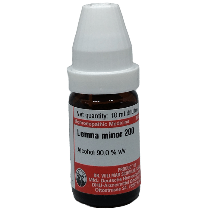 Dr Willmar Schwabe Germany Lemna Minor Dilution It is a homoeopathic medicine, used primarily for the cold and runny nose. It is indicated in breathing difficulties with nasal obstruction, worsened during bad weather. | Key Ingredients: Lemna minor | Key Benefits: Reduces the dryness and putrid smell in mouth on waking up Reduces the abundant discharge which is mixed with mucus and pus Helps relieve headache and pain in the eyes Relieves intense dryness in pharynx and larynx with putrid taste in the mouth | Directions For Use: Use as directed on the label or as advised by your healthcare provider. | Safety Information: Read the label carefully before use Store in a cool and dry place away from direct sunlight Keep out of reach of children