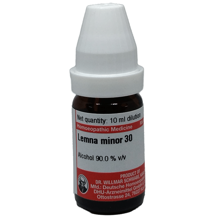 Dr Willmar Schwabe Germany Lemna Minor Dilution It is a homoeopathic medicine, used primarily for the cold and runny nose. It is indicated in breathing difficulties with nasal obstruction, worsened during bad weather. | Key Ingredients: Lemna minor | Key Benefits: Reduces the dryness and putrid smell in mouth on waking up Reduces the abundant discharge which is mixed with mucus and pus Helps relieve headache and pain in the eyes Relieves intense dryness in pharynx and larynx with putrid taste in the mouth | Directions For Use: Use as directed on the label or as advised by your healthcare provider. | Safety Information: Read the label carefully before use Store in a cool and dry place away from direct sunlight Keep out of reach of children