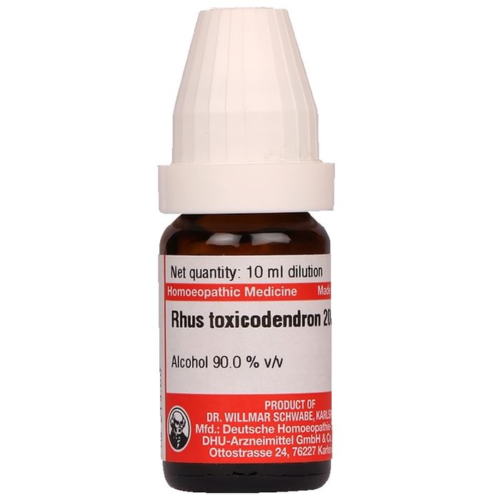 Dr Willmar Schwabe Germany Rhus Toxicodendron Dilution 200 acts on the skin and fibrous tissues such as joints, tendons and sheaths, mucous membranes and blood. It is indicated in fevers, septic conditions, rheumatic problems with pain and swelling in the joints and various skin eruptions such as urticarial rashes, vesicles, herpes, urticaria, large blisters, reddish patches, eczema, military rashes, boils, intense itching of the skin with redness and swelling, and swollen glands. | Key Ingredients: Ethanolic dilution of Rhus toxicodendron | Key Benefits: Generally helpful in relieving symptoms of infections and skin problems Helpful in decreasing inflammation May help repair wounds and ease joint pain Should be taken as per homoeopathic literature | Directions For Use: 4-5 drops 2-3 times a day in ½ cup water | Safety Information: Read the label carefully before use Store in a cool and dry place away from direct sunlight Keep out of reach of children Contains alcohol