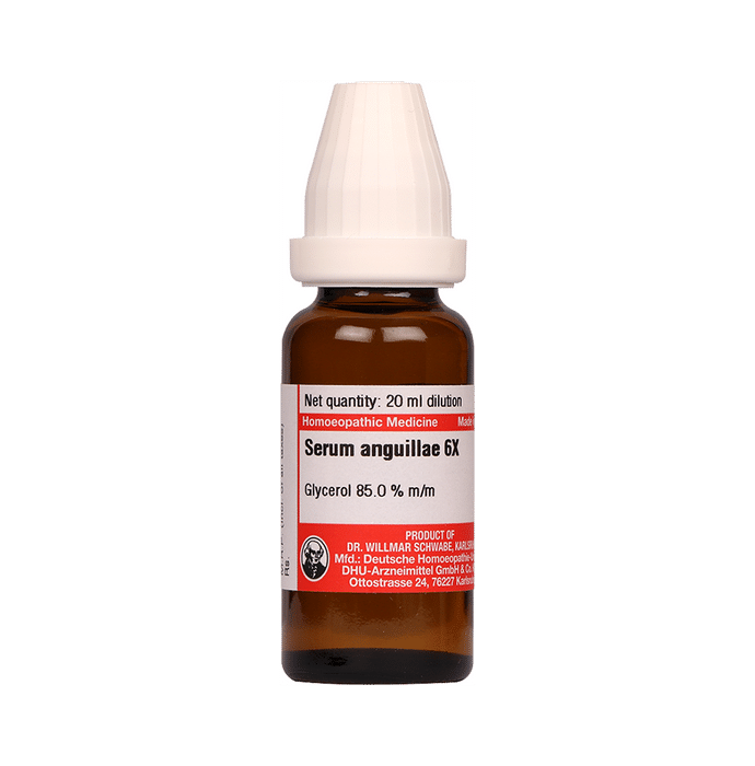 Dr Willmar Schwabe Germany Serum Anguillae Dilution 6X Dr Willmar Schwabe Germany Serum Anguillae Dilution 6X is a homoeopathic dilution prepared from the mother tincture of the Eel serum. It is indicated in cases of subacute nephritis, heart diseases such as asystolia, mitral insufficiencies, dyspnoea, retention of urine, etc.