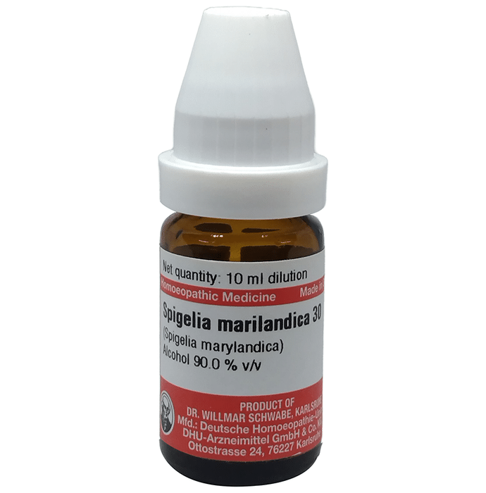Dr Willmar Schwabe Germany Spigelia Marilandica can be effective in dealing with cold and cough. It may help deal with headaches and toothaches. It can also provide relief from pain and inflammation of joints. | Key Ingredients: Spigelia Marilandica | Key Benefits: This formulation can help deal with stomach worms and discomfort It can be effective in dealing with ear pain and discomfort It may help eradicate excess mucus formation in the body This formulation can help combat nerve pain in the body | Directions For Use: Use as directed on the label or as advised by your healthcare provider. | Safety Information: Read the label carefully before use Do not exceed the recommended dosage Store in a cool and dry place away from direct sunlight Keep out of reach of children