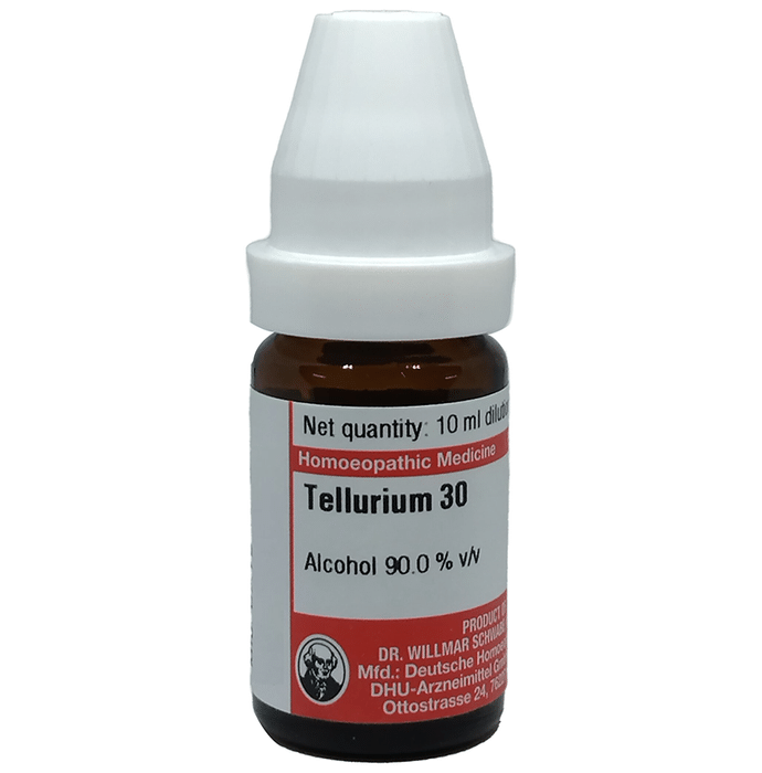 Dr Willmar Schwabe Germany Tellurium Dilution It is effective in the treatment of several issues including skin disorders, pain in the body, especially backaches and reliving ailments associated with ears and eyes. It is also useful in treating disorders related to a stomach-like feeling of emptiness even after proper consumption of meals and also helps in reducing fatigue. | Key Ingredients: Tellurium | Key Benefits: It is primarily used for skin disorders such as acne, pimple eruptions, dry skin and scars Relieves burning sensation and itchiness in the eyes and restricts the discharge of pus from the eye It is also useful in aiding severe headaches and related symptoms such as dizziness, and nausea and promotes better sleep | Directions For Use: Use as directed on the label or as advised by your healthcare provider. | Safety Information: Read the label carefully before use Store in a cool and dry place away from direct sunlight Keep out of reach of children
