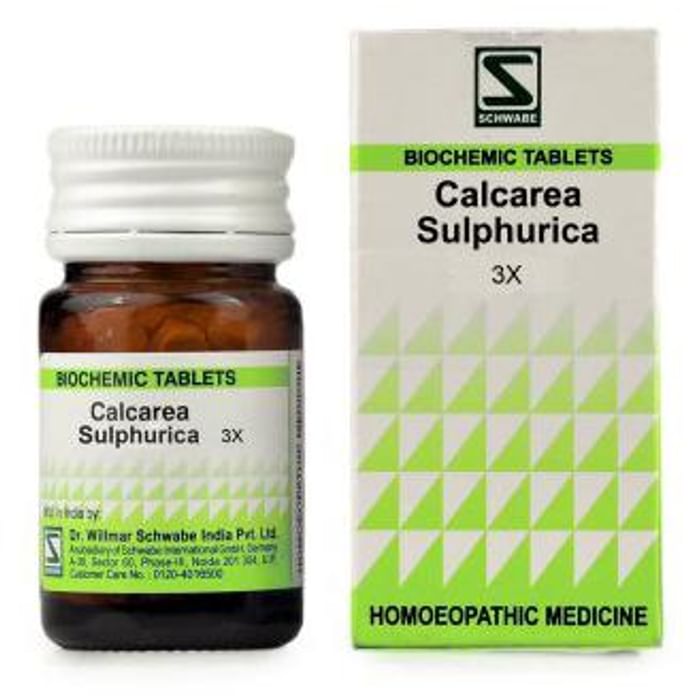 Dr Willmar Schwabe India Calcarea Sulphurica Biochemic Tablet 3X Dr Willmar Schwabe India Calcarea Sulphurica Biochemic Tablet is an effective remedy for the treatment of skin conditions such as eczema, lupus and acne. It is also useful in the treatment of tumours and swollen glands. It can also be used to treat several other health complications and heals minor cuts and wounds. Respiratory ailments like loose cough and collection of fluid in lung cavity can also be treated using this medicine.