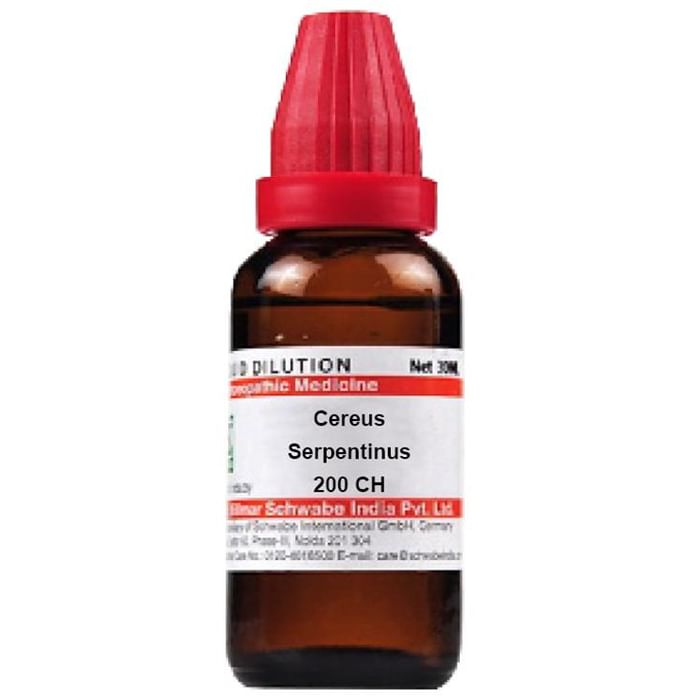 Dr Willmar Schwabe India Cereus Serpentinus Dilution 200 CH Dr Willmar Schwabe India Cereus Serpentinus Dilution is a homeopathic dilution that is indicated for the management of different medical conditions. The mother tincture of is prepared by soaking the raw material in alcohol and pressing and filtering out the tincture. It is useful in treating impoence and enuresis.