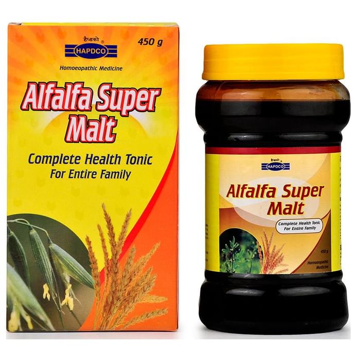 Hapdco Alfalfa Super Malt It is composed of alfalfa, Avena sativa, Cinchona officinalis, Hydrastis candensis, Acidum phosphoricum, Withania somnifera, Calcarea phosphorica, Ferrum phosphoricum, Kali phosphoricum, Magnesium phosphoricum, Natrum phosphoricum Indications Specially Suitable in nervous exhaustion, loss of appetite, worry & overwork, fatigue, sleeplessness. Useful for underweight children, undernourished people, in old age, as a diet supplement in pregnancy. It also helps to increase immunity. Direction for use Adults & Pregnant Women: 2 teaspoonfuls 2 times a day, Children: 1 teaspoonful 2-3 times a day with milk or as a spread on bread toast. Or as directed by the Physician. Use under medical supervision.