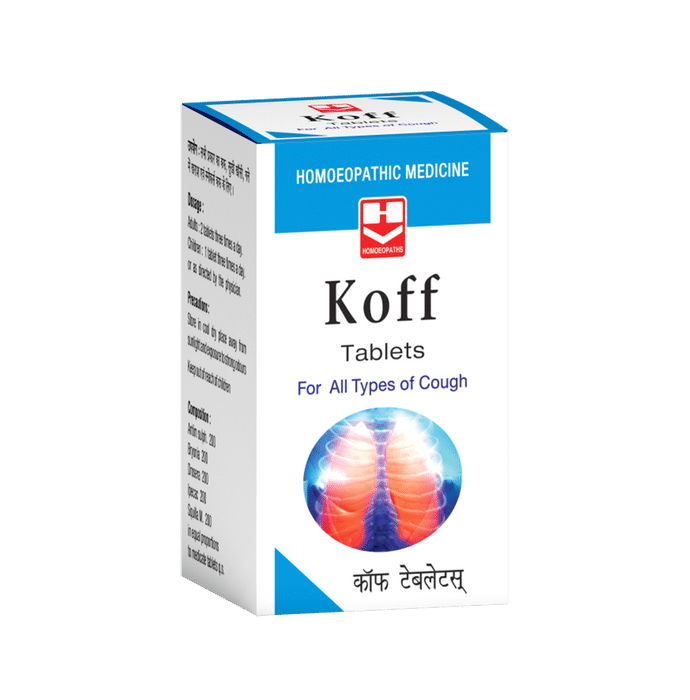 Homeopaths Koff Tablet (25gm Each) Homeopaths Koff Tablet is used for managing different types of coughs like dry, irritating, wet and smokers cough and gives relief to your throat.