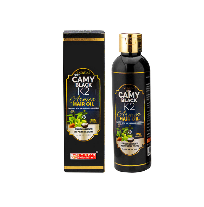 Lord's Camy Black K2 Arnica Hair Oil Lords Camy Black K2 Arnica Hair Oil is an amalgamation of ingredients that help in strengthening the hair, inhibiting hair fall and thus keeping all the diseases and disorders of the scalp at bay. It is also suggested for helping treat Alopecia areata, which is a condition where there is an excessive amount of hair loss, in some cases there is complete hair loss