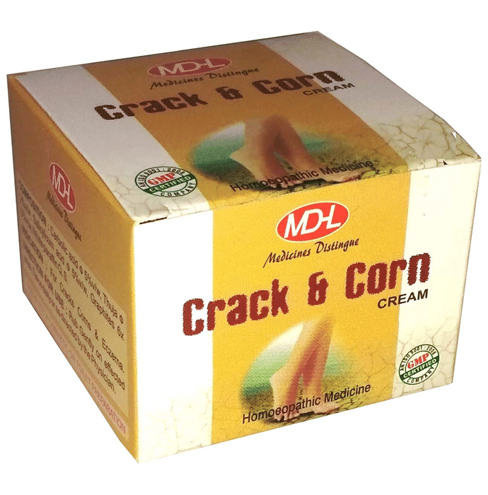 MD Homoeo Crack & Corn Cream is a beneficial homoeopathic medicated cream for cracks, corn, and eczema | Key Ingredients: Carbolic acid Thuja Salycilism acid | Key Benefits: Thuja is used for respiratory tract infections such as bronchitis, bacterial skin infections, and cold sores The presence of salycilism acid may help the skin to shed dead cells from the top layer by decreasing redness and swelling It may help in dealing with cracks | Directions for Use: As prescribed by the physician | Safety Information: Read the label carefully before use Store in a cool and dry place, away from sunlight Keep out of reach of children Don’t exceed the recommended dosage