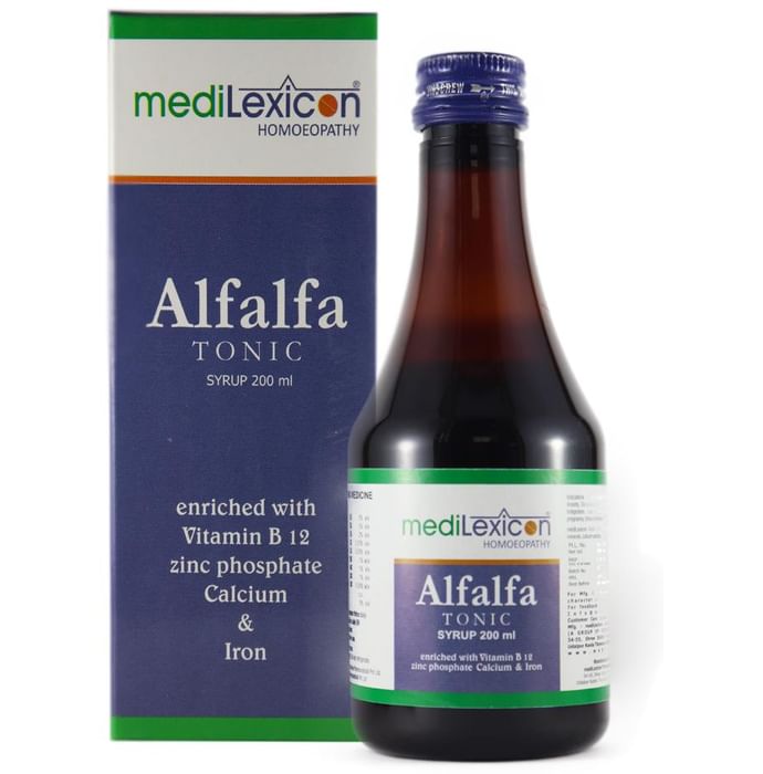 Medilexicon Alfalfa Tonic Syrup Medilexicon Alfalfa Tonic Syrup contains vitamin B-12 which is used to make body stronger and healthier. It contains Calcium which is used to make bones stronger and also contains iron which helps to increase blood cells in the body.