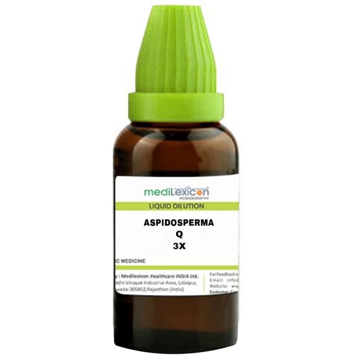 Medilexicon Aspidosperma Q Liquid Dilution 3X Medilexicon Aspidosperma Q Liquid Dilution is also known as Aspidos. It stimulates the respiratory centers and increases the oxygen in the blood. Removing temporary obstruction to the oxidation of the blood, Quebracho relieves dyspnoea and is an effective remedy in many cases of asthma. The conditions of the lower respiratory tract are relieved with help of this medicine. Quebracho is used as a medicine for fluid retention. The medicine is also useful in sexual complaints, to improve the sexual drive in both men and women. In addition, Quebracho is useful to regulate body temperature. Breathing difficulties are relieved with help of Quebracho. There are no such side effects but every medicine should be taken under the guidance of a healthcare expert.