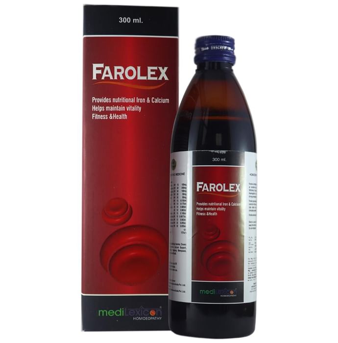 Medilexicon Farolex Syrup is an iron supplement that helps in red blood cell formation and treats iron deficiency anaemia. It is beneficial for bones and teeth.It may lower the risk of blood pressure and reduce symptoms of premenstrual syndrome (PMS). | Key Ingredients: Iron Calcium | Key Benefits: It is beneficial for bones and teeth Iron is also a dietary supplement and used to treat chronic blood loss or poor absorption | Directions for use: Read the label carefully before use | Safety Information: Protect it from direct sunlight, heat and moisture Do not use if seal is broken Keep out of reach of children Store it in a cool, dark and dry place For external use only