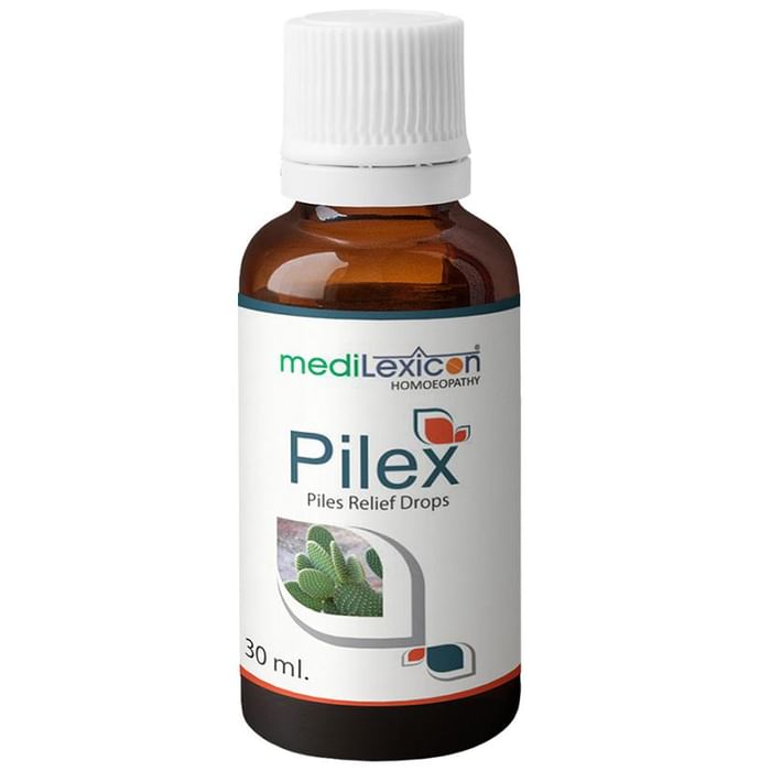 Medilexicon Pilex Piles Relief Drop is an Ayurvedic formulation that provides the combined effects of herbs. It contains detoxifying and laxative properties and anti-inflammatory properties. The combined effect of these ingredients helps to provide relief from piles (haemorrhoids), anal fistula and constipation. According to Ayurveda, the Rechana (laxative) property provides effective aid in the treatment of constipation. | Key Ingredients: Santoninum Naphthaline Tymolum Chenopodium Teucrium Cina | Key Benefits: It works by stimulating the digestive fire, which in turn relieves constipation This further prevents piles and gives relief from the pain, swelling and other discomfort associated with it It also helps reduce the symptoms of anal fistula It can help in weight management due to its laxative properties It improves agni (the digestive fire), which helps promote healthy metabolism and releases excess kapha from the system It is considered safe when taken in the prescribed quantity These properties work in sync in improving the digestive fire, which helps in providing relief from constipation | Directions For Use: Read the label carefully before use. | Safety Information: Read the label carefully before use Store in a cool and dry place away from direct sunlight Keep out of reach of children