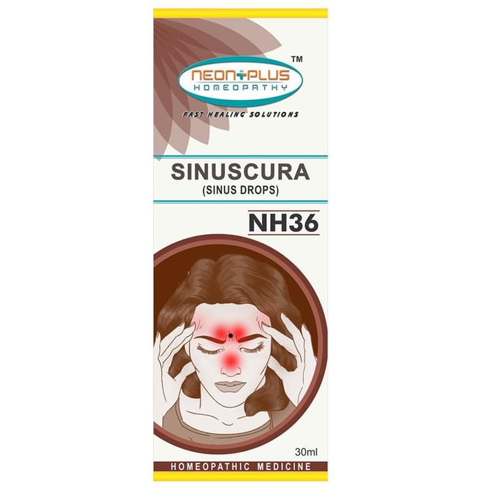 Neon Plus NH36 Sinuscura Drop is a homoeopathic remedy for chronic sinusitis, congestion, painful and frequent headache, chronic sneezing, blocked nose and cheek pain. Sinus can be a discomforting situation and it is caused due to inflammation of the paranasal sinuses. | Key Ingredients: Capsicum Annuum Cinnabaris Echinacea Ang Kreosotum Luffa Operculata Plantago Major Sanicula Europaea Thuja Occid | Key Benefits: Effectively reduces the mucous formation in the frontal, maxillary and paranasal sinuses Primarily used for the treatment of sinus and its associated ailments It is also helpful in relieving sinus-related headaches and migraine | Directions For Use: Children below 5 years: 5 drops in 1/4th cup of water Children between the age of 5 to 10 years: 10 drops in 1/4th cup of water Children above 10 years and adults: 15 drops in 1/4th cup of water | Safety Information: Read the label carefully before use Store in a cool and dry place away from direct sunlight Keep out of reach of the children