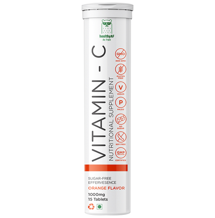 HealthyAF Vitamin-C 1000mg Effervescent Tablet (15 Each) Sugar Free Orange HealthyAF Vitamin-C 1000mg Effervescent Tablet (15 Each) Sugar Free A Dermatologist formulated Vitamin C + Zinc as a sugar-free orange tangy drink. Just drop this sugar-free tablet in a glass of water and instantly enjoy a refreshing orange drink every morning. This effervescent technology helps faster absorption of this antioxidant and helps achieve multiple skin and health benefits.