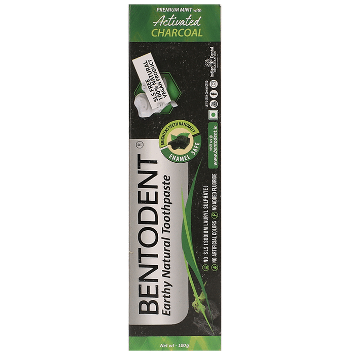 Bentodent Earthy Natural Toothpaste Premium Mint with Activated Charcoal can help cleanse the teeth without negatively affecting the gums and teeth. It does not cause inflammation or irritation to the gums. It may brighten the teeth with the help of bentonite clay. The toothpaste has a pleasant taste that can stimulate saliva and help eliminate bacteria that cause bad breath. This toothpaste is free from fluoride and is safe to be used by all age groups, including children. This is a vegetarian toothpaste and is gluten and SLS-free. | Key Ingredients: Purified Aqua Bentonite clay Salt Methanol Natural Glycolipids Purified Stevia extract Orange extract Grapefruit seed extract Tea tree oil Activated charcoal Peppermint essential oil | Key Benefits: This toothpaste with bentonite clay can help brighten the teeth It has a pleasing taste which may stimulate saliva It can help remove bad breath causing bacteria | Directions For Use: Brush twice a day thoroughly. | Safety Information: Read the label carefully before use Store in a cool and dry place Keep out of reach of children