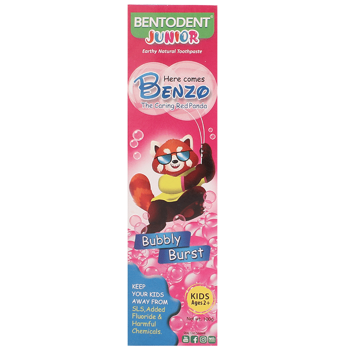 Bentodent Junior Kids Age 2+ Benzo Toothpaste Bubbly Burst can help cleanse the teeth without negatively affecting the gums and teeth. It does not cause inflammation or irritation to the gums. It may brighten the teeth with the help of bentonite clay. The toothpaste has a pleasant taste that can stimulate saliva and help eliminate bacteria that cause bad breath. It can make your breath smell fresh all day. Betel leaf acts as a mouth freshener and may help eliminate plaque-causing bacteria. This toothpaste is free from fluoride and is safe to be used by children. This is a vegetarian toothpaste and is gluten and SLS-free. | Key Ingredients: Purified Aqua Bentonite clay Salt Methanol Natural Glycolipids Purified Stevia extract Orange extract Grapefruit seed extract Tea tree oil Bubble gum flavour | Key Benefits: This toothpaste with bentonite clay can help brighten the teeth It has a pleasing taste which may stimulate saliva It may make the breath smell fresh all-day | Directions For Use: Brush twice a day thoroughly. | Safety Information: Read the label carefully before use Store in a cool and dry place Keep out of reach of children