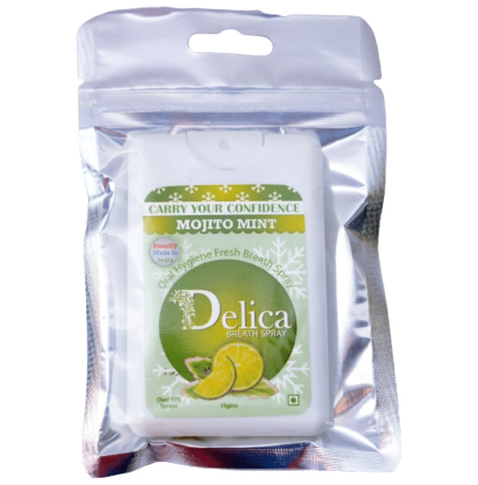 Delica Breath Spray (15gm Each) Mojito Mint has the goodness of eucalyptus oil and peppermint oil that gives you a mint flavour. It can keep your mouth fresh and may fight bad breath. It may clear nostrils and refresh your throat. | Key Ingredients Eucalyptus oil Peppermint oil Menthol oil | Key Benefits: It can keep your mouth fresh and may fight bad breath It may clear nostrils and refreshes your throat It has the goodness of eucalyptus oil and menthol oil It can be kept anywhere even in your kitchen, purse, or car It masks the smell for smokers and tobacco chewers It is long-lasting and non-alcoholic | Directions For Use: Shake well Spray directly into your mouth If needed spray twice | Safety Information: Store in a cool and dry place away from direct sunlight Read the label carefully Keep out of reach of children