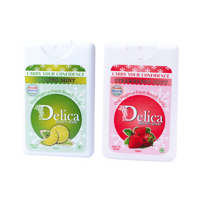 Delica Breath Spray (15gm Each) Mojito Mint, Strawberry MInt Delica Breath Spray (15gm Each) Mojito Mint, Strawberry MInt This pack has the flavours of strawberry and mojito mint. It has the goodness of eucalyptus oil and peppermint oil that gives you a minty or lemon flavour. The strawberry mint gives you a sweet and fresh flavour. It can keep your mouth fresh and may fight bad breath. It may clear nostrils and refresh your throat.