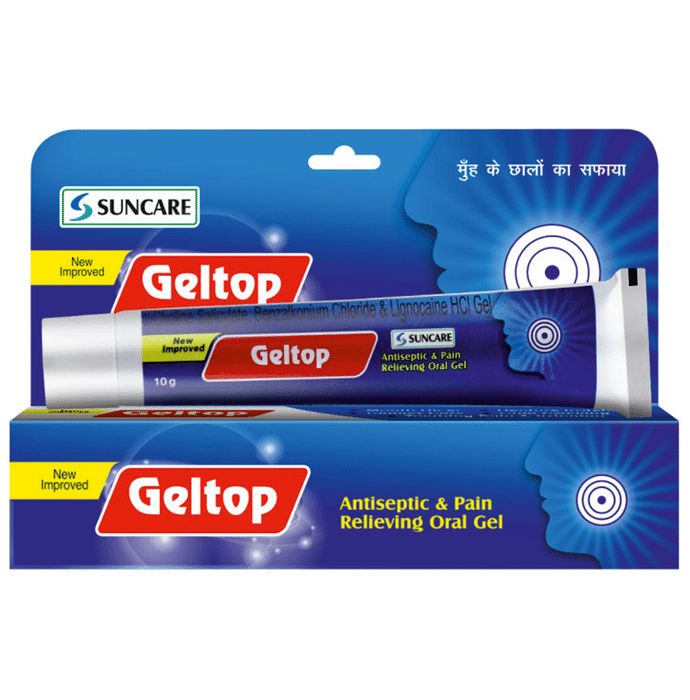 Geltop Oral Gel provides fast relief from severe pain and irritation, caused by mouth ulcers, within 2 minutes. It also provides relief from pain and swelling of the ulcers and has an antibacterial preservative too. Geltop Gel contains choline salicylate, benzalkonium chloride and lignocaine in a flavoured gel base. It decreases and provides relief from the pain that arises due to mouth ulcers and other ulcers on the tongue, the inner side of the cheek, gums and palate. | Key Ingredients: Choline Salicylate Benzalkonium Chloride Lignocaine Gel | Key Benefits: It is an antiseptic and pain-relieving oral gel It decreases and provides relief from the pain that arises due to mouth ulcers and other ulcers on the tongue Relieves ulcers from the inner side of the cheek, gums and palate | Directions For Use: Wash your hands properly before use and dry them well Take sufficient quantity of Geltop Gel on your fingertip Gently apply Geltop Gel directly on and around the affected area Repeat every 3-4 hours as required or as advised by the physician Do not eat or drink anything immediately after applying Geltop Gel | Safety Information: Read the label carefully before use Keep out of reach of the children Store in a cool dry place Patients must avoid hot, spicy and acidic food and drink loads of water. It is also important to maintain good dental hygiene and consult a doctor if mouth ulcers persist