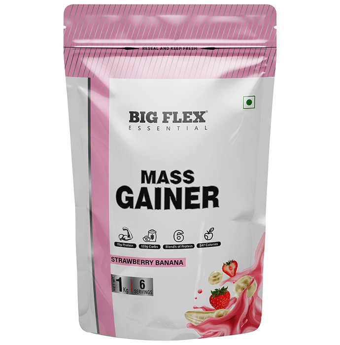 Big Flex Powder Essential Mass Gainer Strawberry Big Flex Essential Mass Gainer Powder Chocolate BigFlex Mass Gainer is a protein supplement that helps you gain muscle mass. Building muscles requires an excess of calories, so BigFlex mass gainer is used to give the body the required nutrition while promoting weight gain. BigFlex mass gainer is out on the market today for people who want their bodies to look muscular and toned.It has 15 grams of high-quality protein, 120 grams of carbohydrates, and other vitamins and minerals required for a person’s nutritional requirements. To ensure that you push yourself to greater physical heights during your training, the product includes several ergogenic aids. BigFlex included 25 vitamins and essential minerals in the formula to help your body function properly.BigFlex Muscle Mass Gainer has extra enzymes, which help to promote better digestion. It’s a high-calorie weight gainer that helps you build mass and aids your muscles in recovery by accelerating growth. The product is available in a variety of tastes and is very pleasant to consume. One of the greatest characteristics of BigFlex Muscle mass gainer is its capacity to mix well with water and milk. This feature makes it simple for anybody who prefers shakes rather than solid meals to boost their calorie intake without feeling guilty about eating too much all at once.