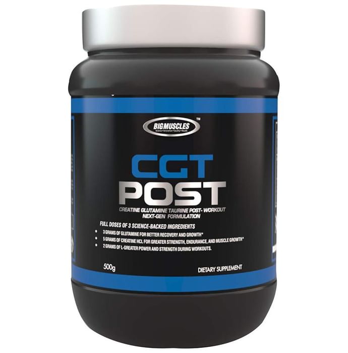 Big Muscle CGT Post comes in raspberry flavour and provides optimum combination of Creatine HCL, Glutamine and Taurine. Creatine supplementation leads to significant gains in muscle strength and power, as well as muscle growth. This drastically increases creatine solubility in fluids, which increases its absorption and reduces stomach issues. | Key Ingredients: Calories Creatine Taurine | Key Benefits: Helps in reducing muscle breakdown, supports faster recovery and greater strength during workout Glutamine supplements may improve health, decrease infections and lead to shorter hospital stays after surgery It helps maintain the barrier between the inside of your intestines and the rest of your body, thereby protecting against a leaky gut Promotes cardiovascular health, insulin sensitivity, electrolyte balance, hearing function, and immune modulation. It protects against heart failure, reducing mortality by nearly 80%. | Directions For Use: Read the label or as directed by the physician. | Safety Information: Read the label carefully before use Store in a cool and dry place away from direct sunlight Keep away from children Do not exceed the recommended dosage Take under medical supervision only