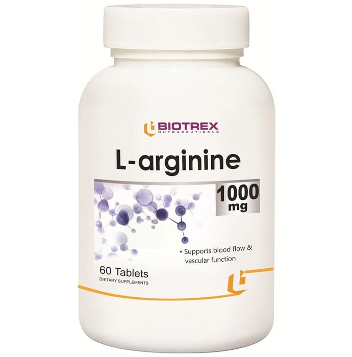 Biotrex L-arginine 1000mg Tablet has the core ingredient L-arginine which is an amino acid that helps the body maintain healthy cardiovascular function and blood flow. It is an amino acid that the body can healthily synthesize to help body function. | Key Ingredients: L-arginine | Key Benefits: WIth its help the body can synthesize sufficient amounts of it under normal conditions It contains L-arginine which is an amino acid that helps the body maintain healthy cardiovascular function and blood flow It is an amino acid that the body can healthily synthesize to help body function Helps in cardiovascular functioning | Directions For Use: As indicated on the label or as prescribed by your doctor physician. | Safety Information: Read the label carefully before use Keep out of the reach of children If you are pregnant or taking any other medications consult a doctor first