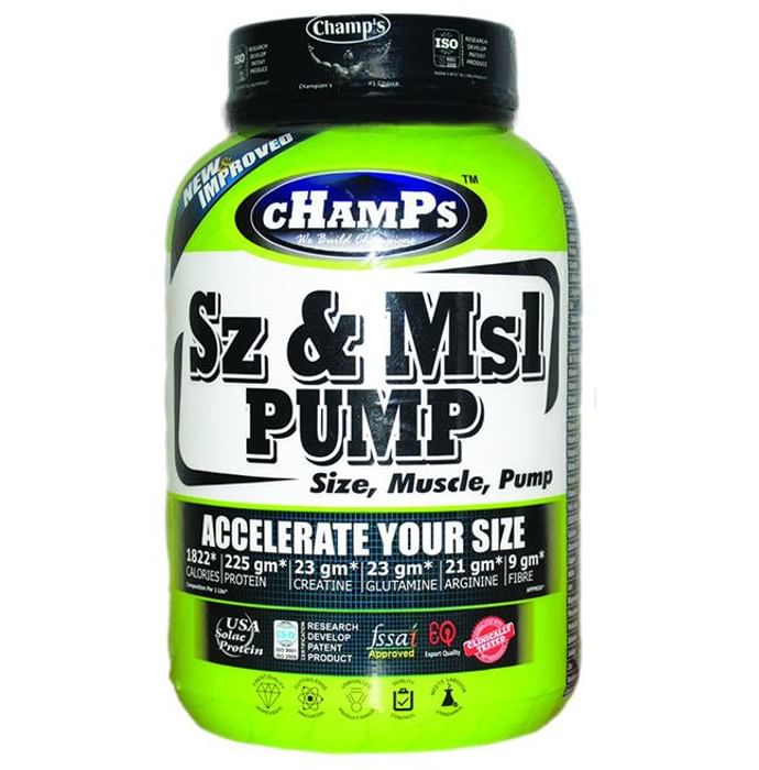 Champ's Sz & Msl Pump is a food supplement that will add useful calories to individuals with active lifestyles looking to increase or maintain body mass. It contains vitamins and minerals that are essential for the developent of the body. It can be used by athletes, bodybuilders and a normal person looking to gain muscle mass. | Key Ingredients: Soya protein Isolate Skimmed Milk Powder Aspartum Minerals Vitamins | Key Benefits: It is useful in pumping muscles It helps in increasing performance by 23.9% It is helpful in reducing muscle damage It promotes the speedy recovery of damaged muscles | Directions For Use: Take 2 times a day with milk Use first in morning with breakfast and before/after exercise or after weight training in evening | Safety Information: Read the label carefully Self medication is not advised Do not exceed the recommended dosage Keep out of the reach of children Store in a cool and dry place
